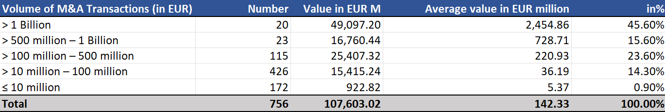 4. The following analysis presents the M&A transactions in Germany registered in public data-bases for 2024.8 Although larger transactions exceeding 500 million euros accounted for over 61% of the total registered transaction volume, there is an ongoing trend towards smaller acquisitions and mergers, as in prior year. More than half of the 756 transactions analysed had volumes rang-ing from 10 to 100 million euros. The following table provides an overview of the number and volume of transactions across different size categories.